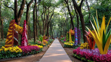 A stunning view of a beautiful garden pathway encircled by colorful flowers and lush greenery, creating a serene and inviting atmosphere for nature lovers.