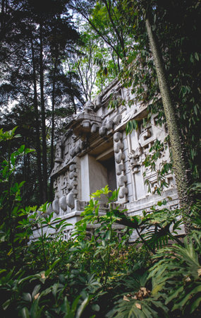A detailed view of a replica of an ancient Mayan structure, partially covered by lush vegetation