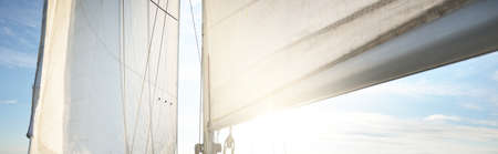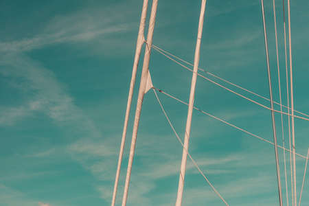 Yachting sail mast detail on sunny sky background. Romantic adventure book cover idea design