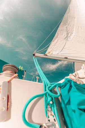 Sails of a modern white sloop rigged charter yacht. Low angle view. Mediterranean sea. Private vessel for rent, cruise, recreation, leisure activity, sport, regatta, rigging equipment