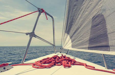 Sailboat deck with stacked red rope while sailing. Enjoying sun and wind on the open ocean.