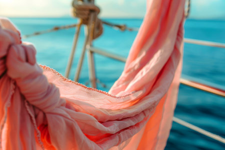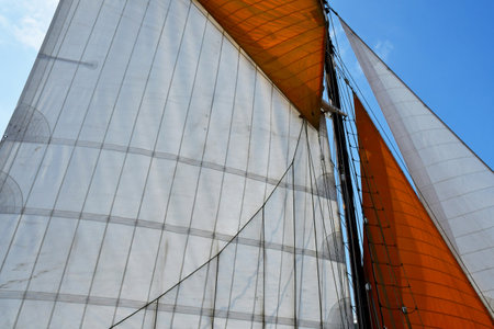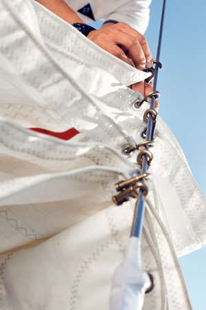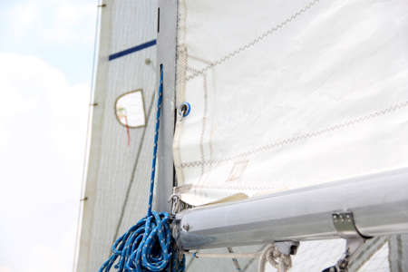 Detailed closeup of sail fabric on sailboat, outdoor shot. Marine objects concept.