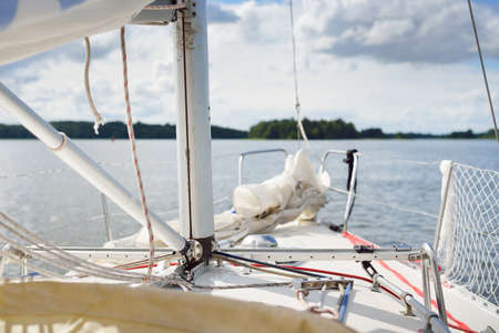 White yacht sailing after the storm. View of the mast, sails, rigging equipment. 32 feet swedish built cruising sailboat. Mälaren lake, Sweden. Summer vacations, recreation, sport, leisure activity