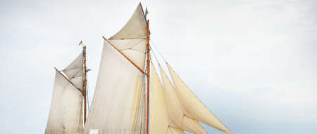 An elegant two-masted gaff schooner (tall ship). Mast and sails close-up. History, transportation, sport, recreation, cruise, regatta. Concept image