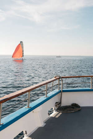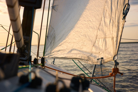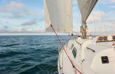 White sloop rigged yacht sailing in an open sea at sunset. Clear sky. A view from the deck to the bow, mast, sails. Transportation, travel, cruise, sport, recreation, leisure activity, racing, regatta