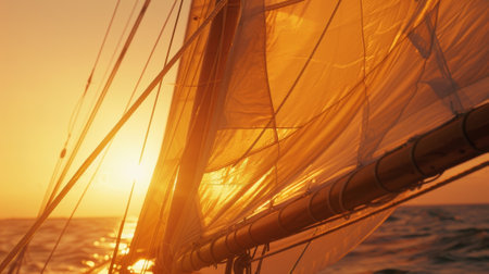 Yacht sailing in an open sea at sunset. Close-up view of the deck, mast and sails. Clear sky after the rain, dramatic glowing clouds, golden sunlight, waves and water splashes, cyclone. Epic seascape