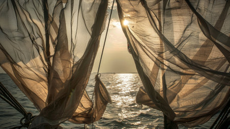 A large sail billows as it catches the wind with a backdrop of a cloudy sky during sunset creating a serene maritime atmosphere.