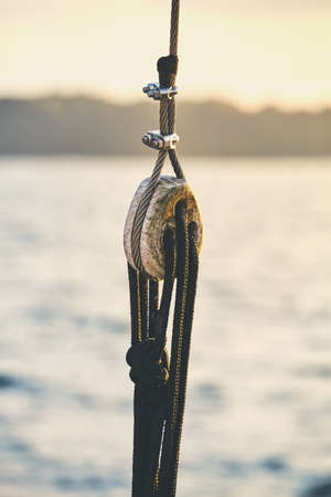 Detailed closeup of rigging on sail boat during cruise. Marine objects concept.