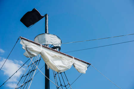 Mast, sails and shroud of a tall ship. Rigging detail.