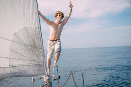 Young Sailor relaxing happily on the vacation sailboat yacht standing on handrail having a rest on summer boat over blue ocean wave background