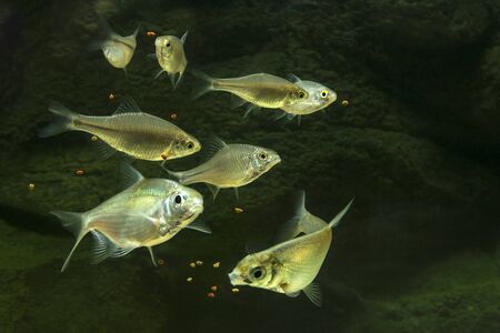 Close-up of a group of fish in the aquarium. Selective focus.