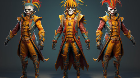 closeup of a creepy evil clown, wearing a gray costume with a white ruff and red pom-poms, in the woods at dusk, in a panoramic format to use as web banner or header