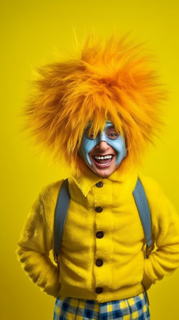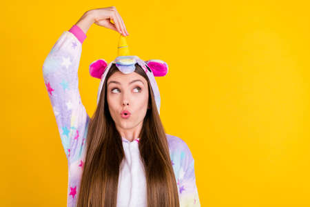Portrait of attractive amazed girl having fun touching horn wearing kingurumi isolated over bright yellow color background