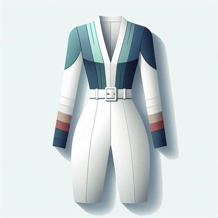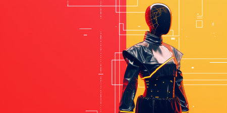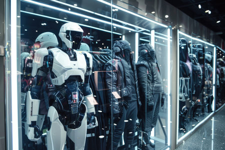 A futuristic outfit is presented in a sleek exhibition area, highlighting advanced design and technology features.