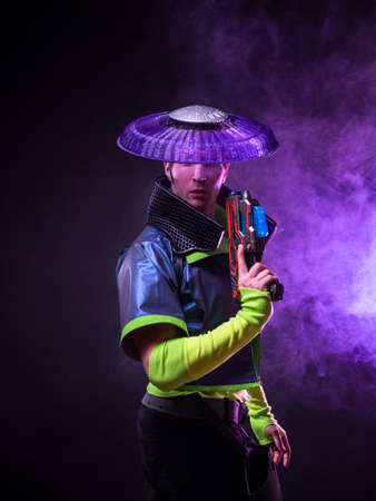 Futuristic character in a bright stylized outfit, photo with neon colors. A fantastic character, a cyber mercenary