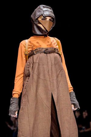 MOSCOW, RUSSIA - MARCH 21, 2019: Model walk runway for TOCHKA RU DESIGN FESTIVAL catwalk at Autumn-Winter 2019-2020 Moscow Fashion Week.