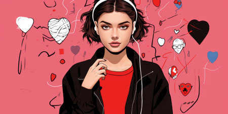 Beautiful young woman listening to music with headphones. Fashionable girl in the 90s style. Vector illustration.