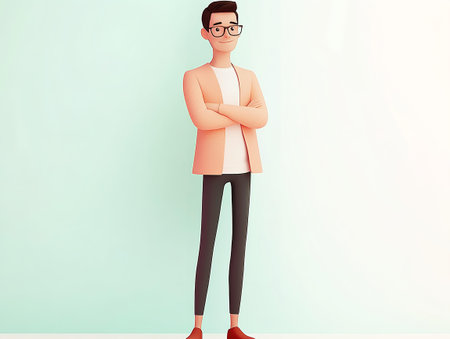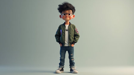 Stylized boy in green jacket jeans sneakers glasses against gradient background