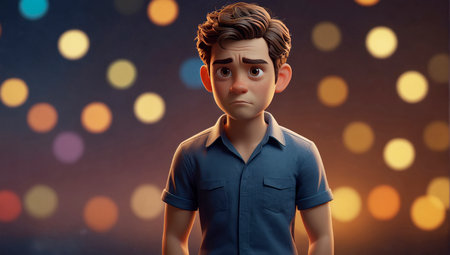 Animated Character in Uniform with Large Eyes and Expressive Face, Dark Background, 3D Rendered Art, Digital Illustration, Character Design, Single Character Focus, Animated Film Style AI Generative