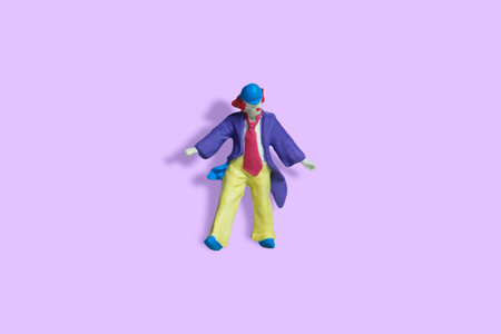 Miniature people toy figure photography. Full body of a clown wearing huge tie and suit. Isolate on purple background. Image photo