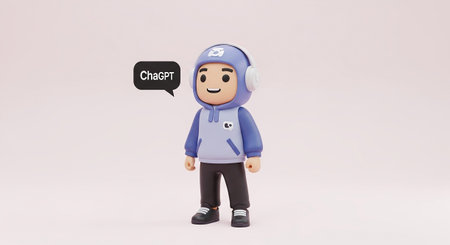 A charming 3D cartoon character, designed in a cute and stylized chibi aesthetic, stands against a plain pink background. The character wears a blue hoodie, dark pants, and sneakers, with large white headphones around its head. A speech bubble above its head ChatGPT, indicating its association with the AI. The overall impression is friendly, modern, and approachable, representing a digital persona or assistant.