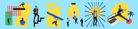 Bright contemporary collage made of shots of young men, managers working hardly isolated over blue background. Concept of business lifestyle, finance, career