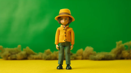 A toy doll with a yellow hat and a yellow shirt stands in front of a green background. Generative AI