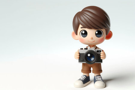 Cute Child Holding Blue Camera, Wearing Yellow Raincoat and Glasses Against Orange Background Adorable Photography Enthusiast Illustration AI Generative