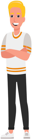 Smiling man in casual clothes and sneakers. Laughing guy in sportswear icon. Boy in bright shirt with arms crossed on chest. Blond male character, athlete, sportsman isolated on white background