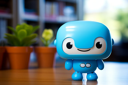 The blue robot toy, with a friendly smile, is positioned on a wooden table surrounded by potted plants, creating a cheerful atmosphere in a cozy interior space.