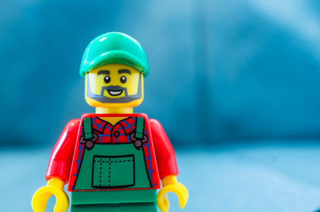 POZNAN, POLAND - Mar 22, 2020: Lego farmer figurine with green hat in soft focus background.