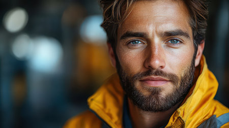 A young man with blue eyes and a beard poses comfortably in a yellow jacket. His expression is calm and approachable in a relaxed setting.