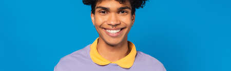 pleased african american man with piercing looking at camera isolated on blue, banner