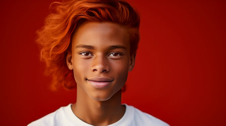 Cheerful smiling African American red-haired teenager guy with long red-haired hair and perfect skin, red background. Advertising of teenage cosmetics, hair care products, medicines, perfumes, cosmetology, courses, college schools and trainings