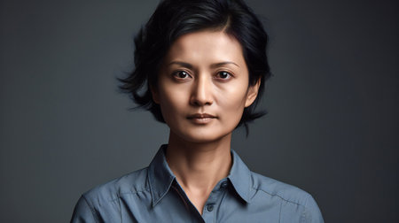 Portrait of a beautiful asian woman in blue shirt on grey background