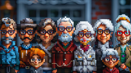 A group of pixelated people in the city, 8 bit.