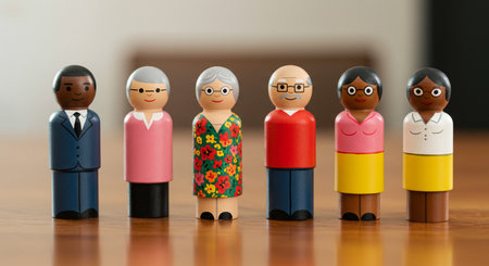 A joyful arrangement of colorful toy figures in a precise lineup, each representing individuality yet united in purpose, ideal for conveying themes of diversity and unity, banner