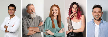 Collage with photos of happy attractive people on light gray background. banner design