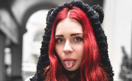 Close portrait of a smiling teen girl with red hair in warm clothes standing outside and looks into the camera and jokely showing her tongue.
