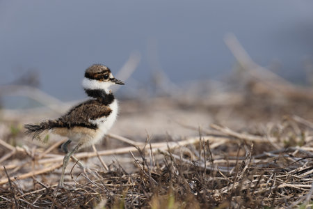 A female killdeer bird walking near the waters edge in a central Kansas wetland environment.