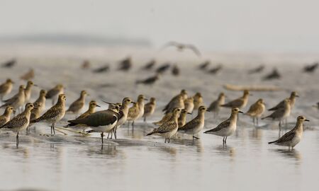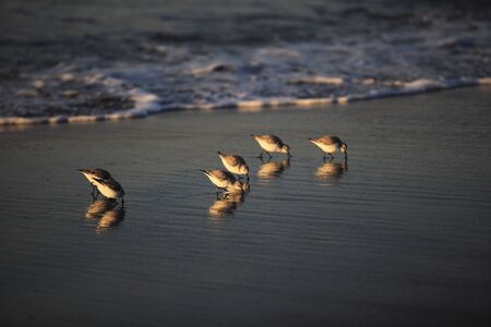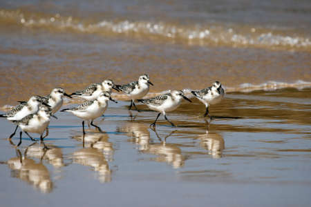 Flock of sanderling and sand piper wading birds foraging in the waters edge. . High quality photo