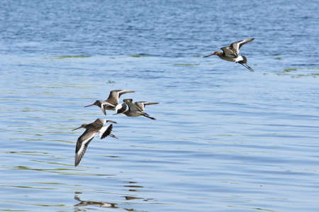 Migratory Wader Birds resting in Wetland on Migration route in the Netherlands. Dutch Marshlands are used by Migratory Stilt Wader Birds as layovers during their long Journey. Wildlife scene in Nature of Europe.