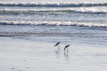 Piping plovers walking in search of food on the ecge of the ocean off of Fire Island New York.