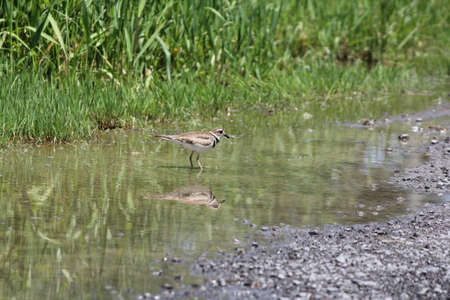 Killdeer in a puddle of water at the side of a rural roadway left by recent rains