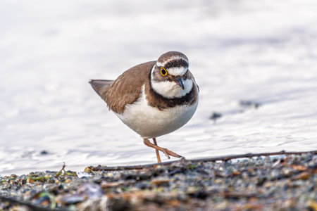 The young common ringed plover or ringed plover (Charadrius hiaticula) is filmed in the soft morning light on the shore of a salty estuary. Close-up and detailed photo. The bird is looking directly into the camera lens