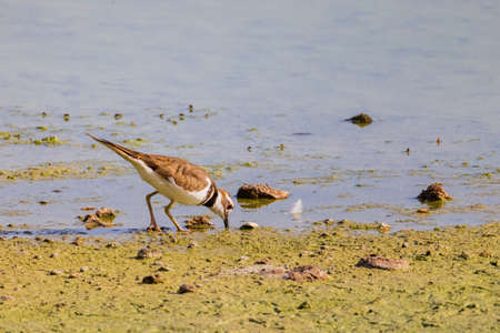 Killdeer Shorebird on Rocky Muddy Shoreline Searching for Food among the rocks.