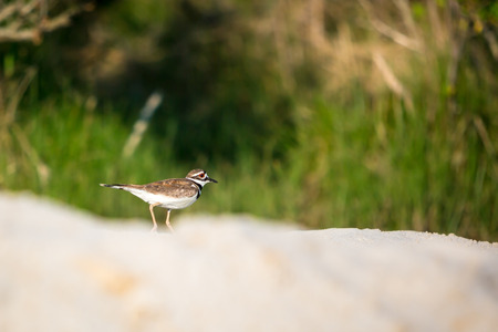 Cute noisy bird Killdeer is standing in green grass near the road in summer sunny day.