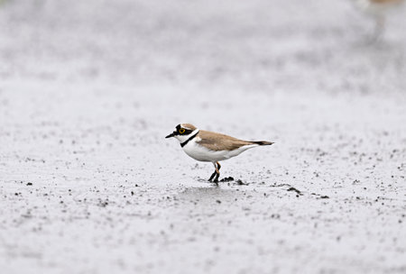 Little ringed plover (Charadrius dubius) searching for food in the wetlands in spring.