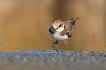 Little ringed plover (Charadrius dubius) searching for food in the wetlands in spring.