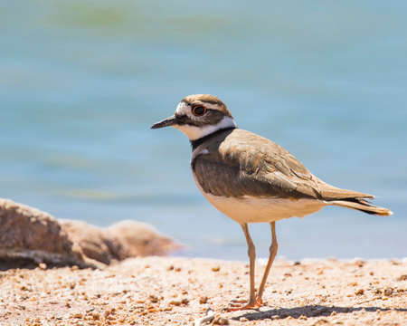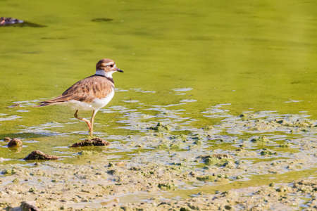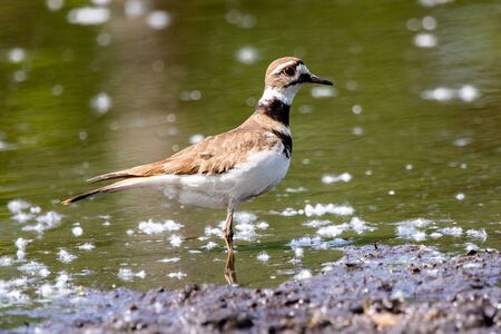 A female killdeer bird walking near the waters edge in a central Kansas wetland environment.